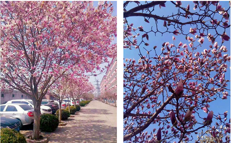 一树树榆叶梅,灿烂多姿,清香宜人,在晨露里含笑绽放,在春风里摇摆着娇媚的身姿。京华厂区里的海棠高低错落、疏密有致。